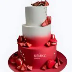 Белоснежный свадебный торт в три яруса с нежным велюровым покрытием. Градиентное омбре от белого к насыщенному красному создает эффектный контраст. Украшен свежими ягодами клубники и воздушными макарунами, которые добавляют торту легкость и праздничное настроение. Аппликации из сахарной мастики придают композиции изысканность и завершенность.