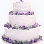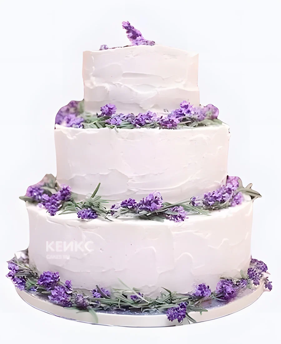 Белый свадебный торт с фиолетовыми цветочками на ветке