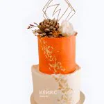 Белый свадебный торт с оранжевым ярусом цветами и воздушной фигуркой