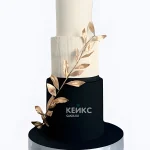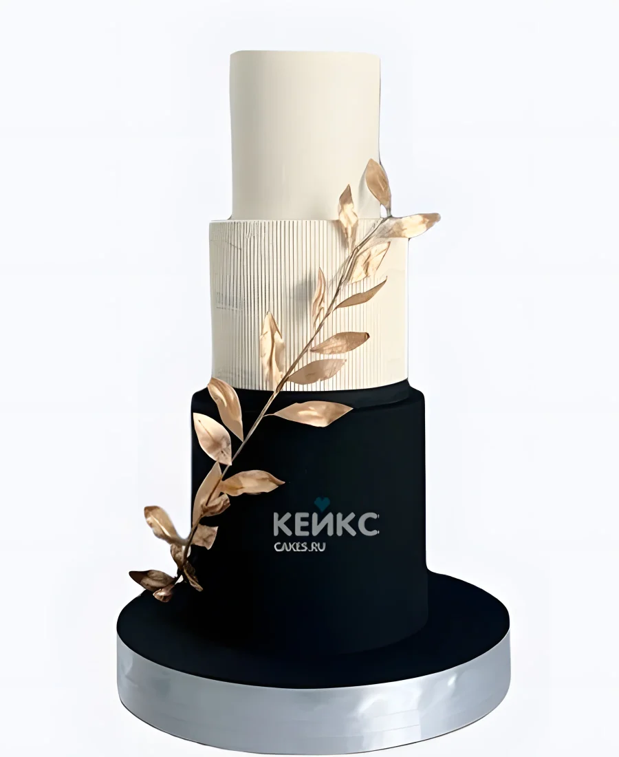 Белый свадебный торт трехъярусный с черным ярусом и золотой веточкой