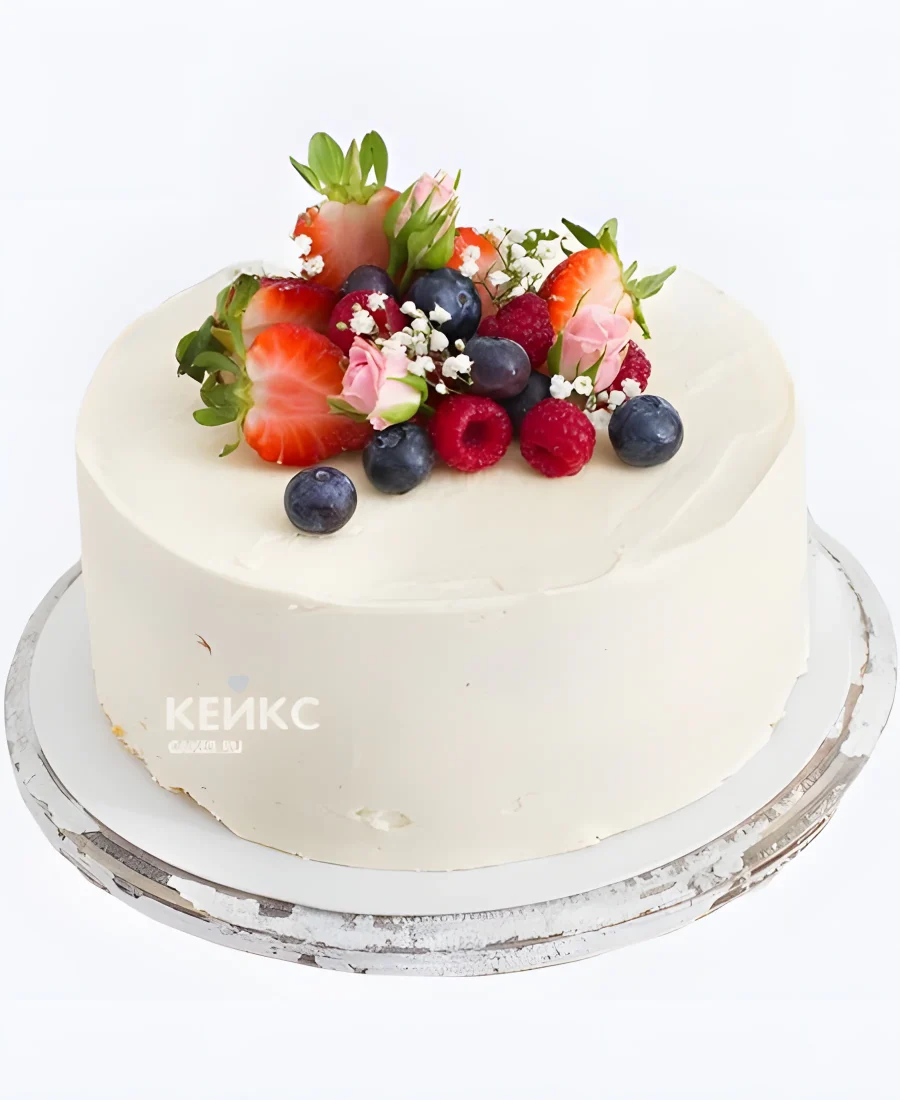 Белый торт на 8 марта с ягодами и кустовыми розами