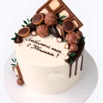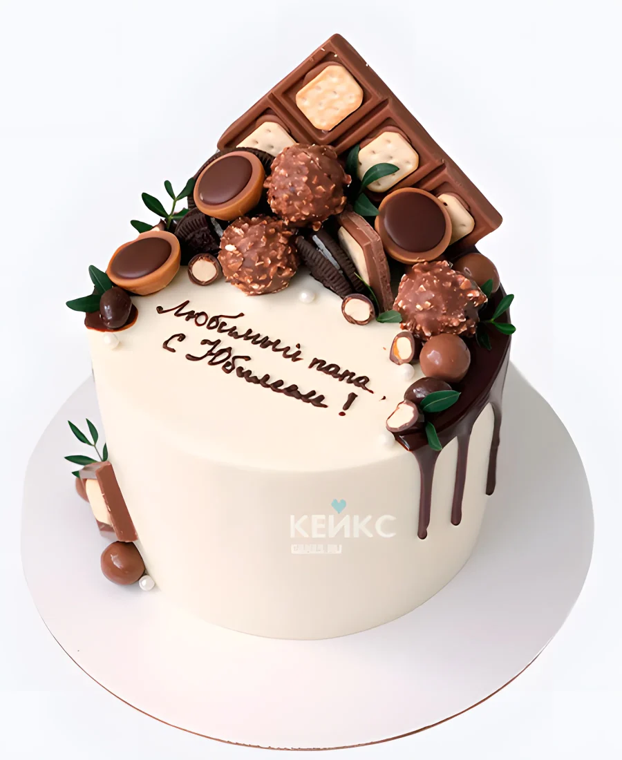 Белый торт с шоколадными сладостями на юбилей папе