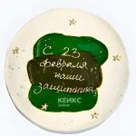Этот торт в стиле бенто посвящен 23 февраля. На темно-синем фоне выделяются золотые детали: звезды, погоны и надпись. Композиция строгая и лаконичная, но сдержанная элегантность золота добавляет торжественности. Круглая форма и гладкое кремовое покрытие создают ощущение аккуратности и завершенности. Военная тематика передана без излишней вычурности, через символичные элементы.