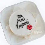 Круглый торт в стиле бенто украшен в военной тематике. На нежно-голубом креме изображены погоны с красными просветами и звездой. Рядом — трогательная надпись «С поцелуем!» и след от губной помады. Минималистичное оформление создает одновременно строгий и романтичный образ, идеально передающий атмосферу праздника. Сочетание пастельных и ярких акцентов выглядит гармонично и стильно.