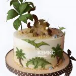 Круглый торт в стиле бенто с яркой тропической палитрой. На поверхности — забавные динозавры среди сочной зелени и миниатюрная пальма. Игривые фигурки и сочные оттенки создают атмосферу доисторического приключения. Мастика передает фактуру листьев и чешуи, добавляя объем композиции.
