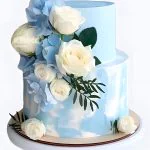 Нежный бирюзовый торт словно соткан из воздушных облаков. Два яруса украшены изящными кремовыми рюшами, создающими эффект лёгкой ткани. На верхнем ярусе расположилась композиция из белоснежных цветов с зелёными акцентами, напоминающая изысканный свадебный букет. Пастельные оттенки бирюзового гармонично сочетаются с белыми элементами, создавая романтичное и элегантное визуальное впечатление.