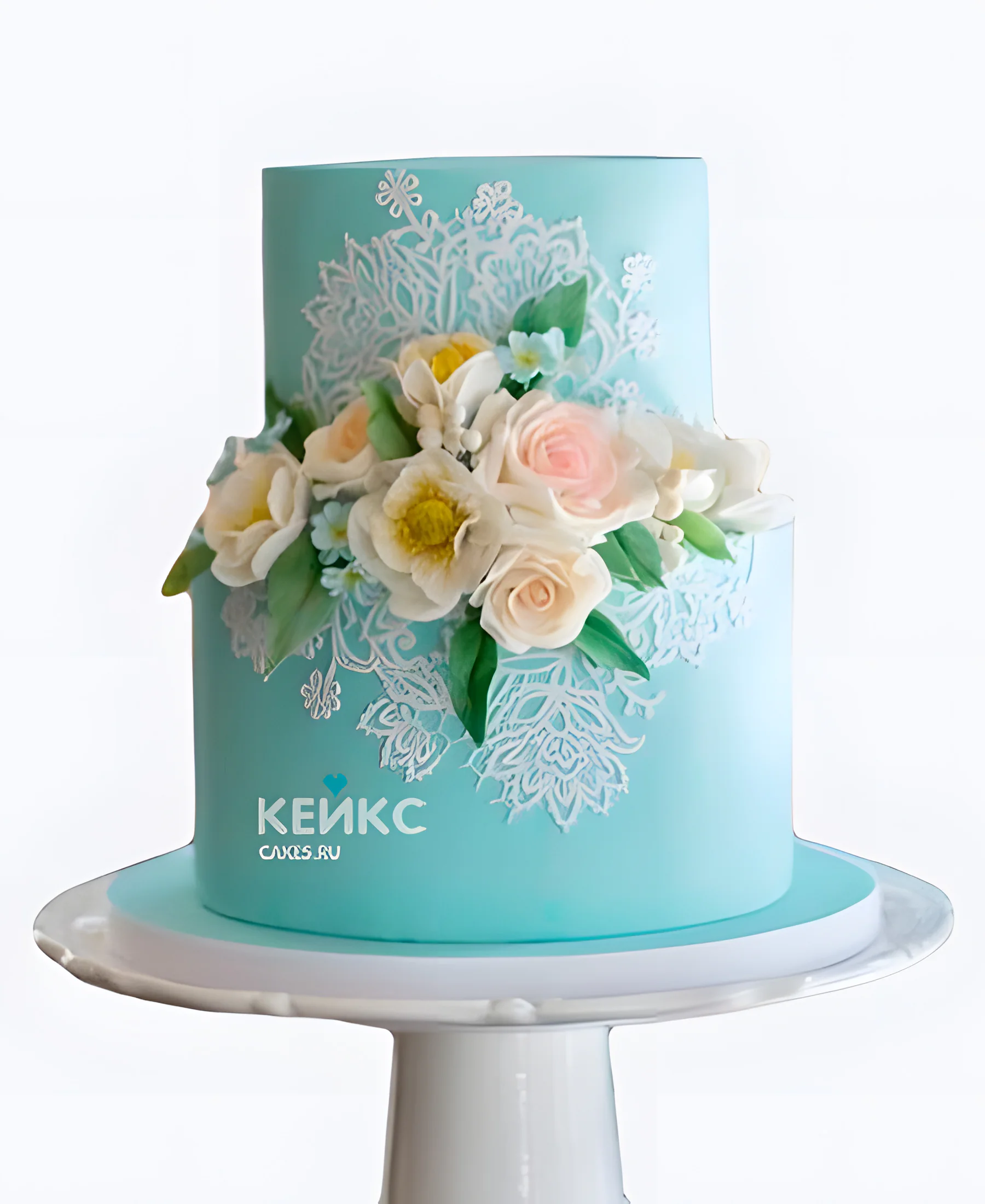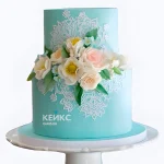 Бирюзовый свадебный торт с белым кружевом