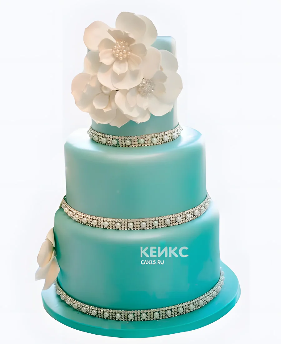 Бирюзовый свадебный торт с ожерельем и цветами