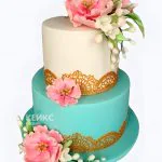 Бирюзовый свадебный торт с розовыми цветами и кружевом