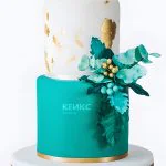 Этот двухъярусный свадебный торт словно соткан из нежных бирюзовых оттенков, переливающихся под светом люстр. Золотые акценты в виде изящных пятен и тонких линий придают ему благородный блеск, напоминающий драгоценные украшения. Веточка с мелкими цветами, будто случайно упавшая на торт, добавляет нотку природной легкости. Гладкая мастика создает ощущение шелковистой поверхности, а мягкие переходы цвета между ярусами делают торт воздушным и гармоничным.