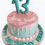Бирюзовый торт на 13 лет с розовыми подтеками и цифрой