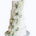 Этот величественный свадебный торт напоминает водопад из белоснежных роз, струящийся по ярусам. Четыре уровня идеально ровных кругов создают ощущение легкости и воздушности, несмотря на внушительные размеры. Каждый лепесток искусно выполненного цветочного декора выглядит нежным и реалистичным. Мягкие складки крема между розами добавляют торту объем и динамику. Чистота белого цвета подчеркивает торжественность момента, а изящные переходы между ярусами создают гармоничную композицию.
