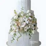 Большой свадебный торт с вертикальными линиями и белым букетом