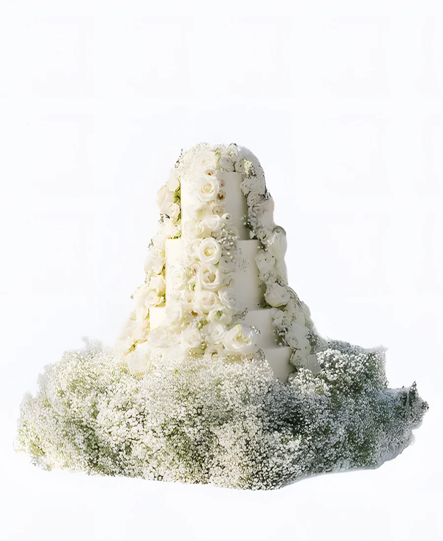 Большой трендовый торт на свадьбу с эустомой и гипсофилой