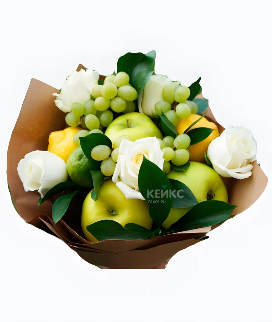 Букет с виноградом, цветами и желтыми лимонами