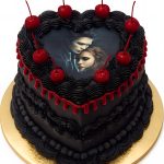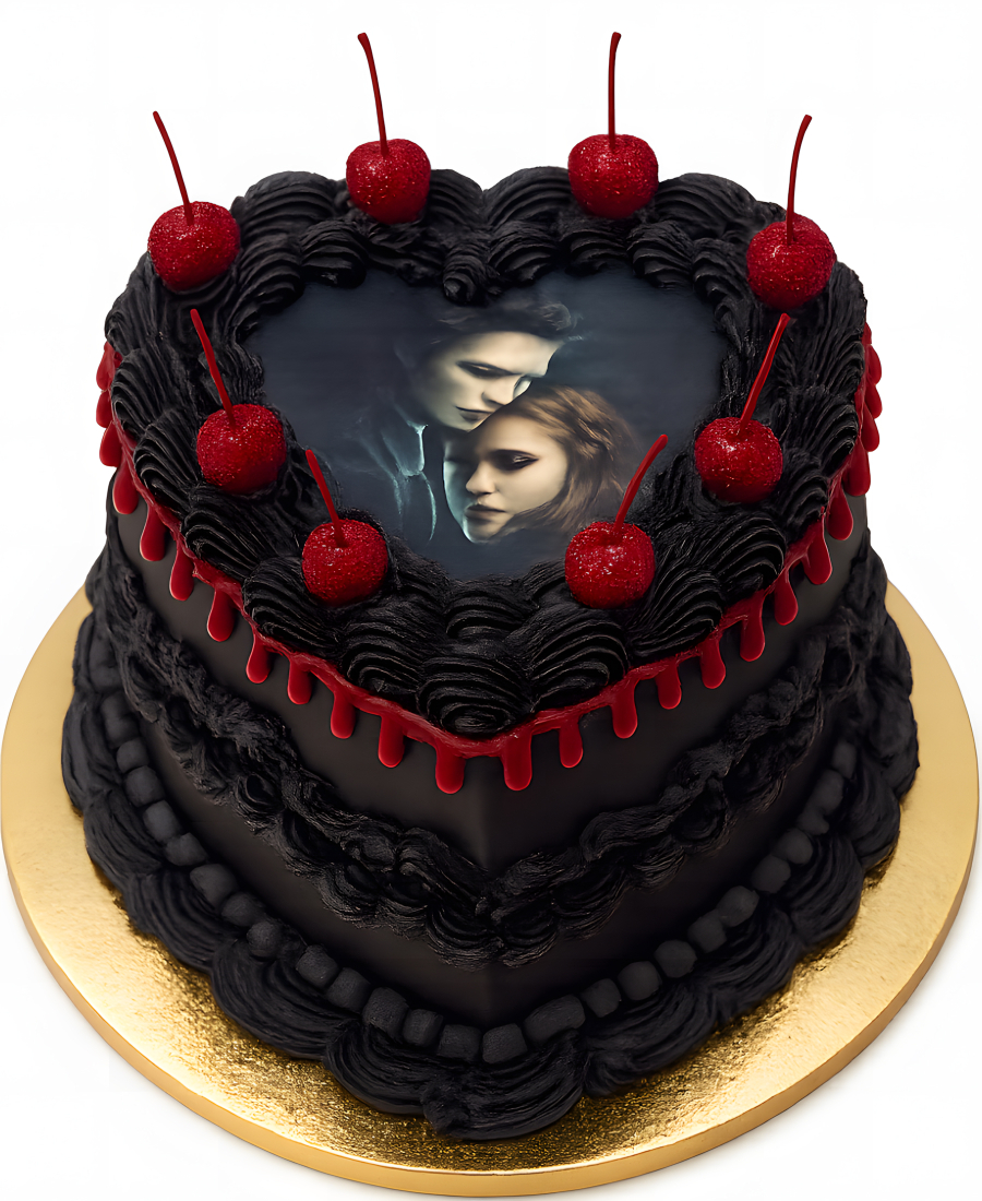 Черный торт с вишенками и главными героями из фильма Сумерки