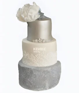 Бело серебряный торт с кружевами и цветком Фото Заказать