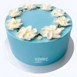 Нежный круглый торт в пастельных тонах украшен воздушными белыми цветами. Сочные розовые и голубые акценты создают весеннее настроение, а золотистые блестки добавляют торжественности. Композиция из сахарных цветов и листьев выглядит как миниатюрный сказочный сад. Идеально для детского праздника — мило, ярко и волшебно.