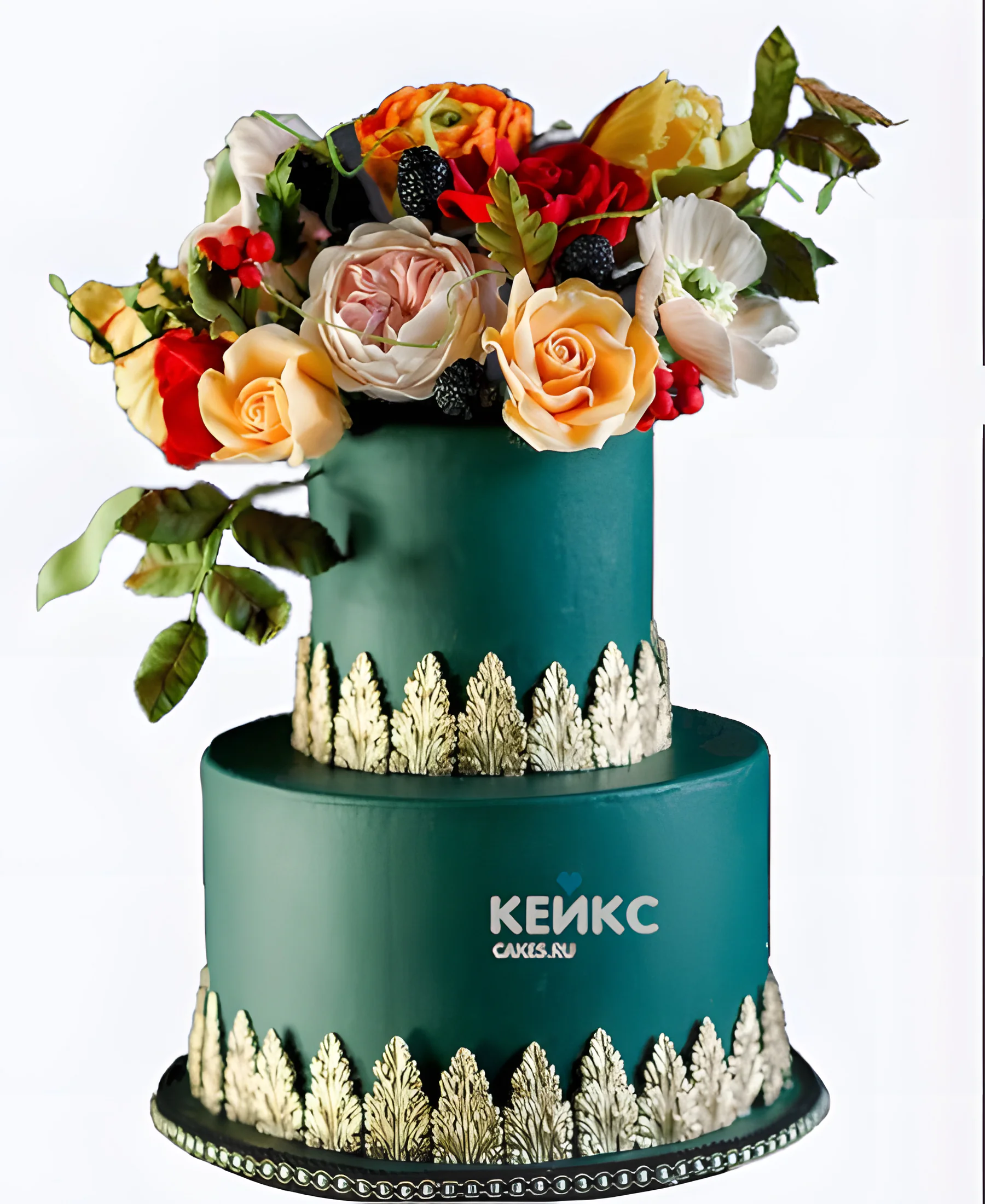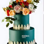 Дорогой торт в изумрудном цвете с букетом живых цветов