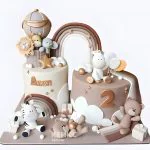 Эти два очаровательных торта словно сошли со страниц детской книжки! Мягкие пастельные оттенки голубого, бежевого и розового создают нежную атмосферу. На каждом торте — милые зверушки с добрыми глазами: слонёнок и львёнок, выполненные в технике аппликации из мастики. Простые круглые формы украшены тонкими линиями и точками, что добавляет тортам игривости. Тематика животных и спокойная цветовая гамма делают эти десерты трогательными и по-настоящему детскими.