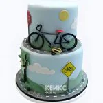 Двухъярусный голубой торт мальчику на 14 лет с велосипедом