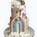 Этот яркий двухъярусный торт словно сошел со страниц сказки! Нижний ярус украшен нежными облаками из крема, а верхний — веселой радугой, переливающейся всеми цветами. Белоснежная основа создает контраст с сочными оттенками, делая торт по-настоящему праздничным. Кажется, будто он излучает радость и детский восторг. Идеально для того, чтобы устроить незабываемый праздник для малыша!