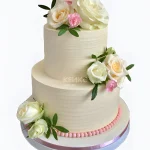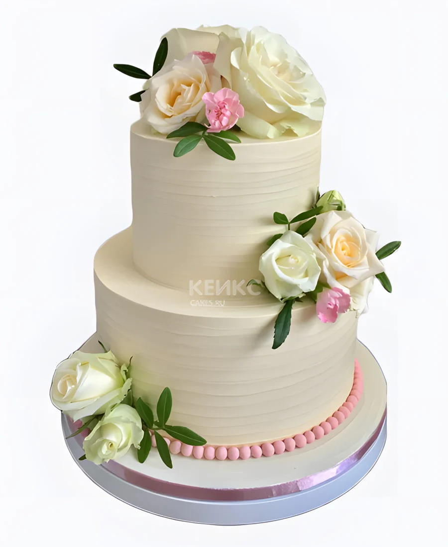 Двухъярусный свадебный торт без мастики с цветами и бусинами