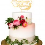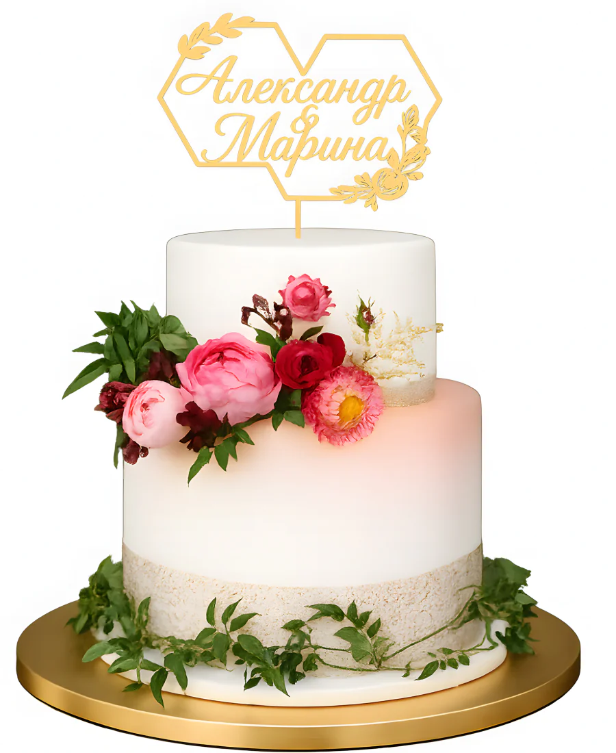 Двухъярусный свадебный торт с мастикой и топпером золотого цвета