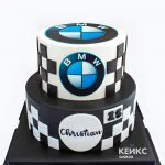 Этот двухъярусный торт — настоящая мечта для автолюбителя! Нижний ярус выполнен в виде стилизованного колеса, а верхний украшен логотипом BMW, словно эмблема на капоте. Сочетание черного, белого и синего цветов создает эффектный контраст, напоминающий фирменную расцветку бренда. Глянцевая мастика придает торту сходство с лакированным кузовом автомобиля. Минималистичный, но выразительный дизайн подчеркивает мужской характер и любовь к скорости.