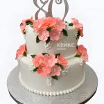 Двухъярусный торт на юбилей 80 лет с персиковыми цветами