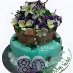 Двухъярусный торт с корзиной цветов на юбилей 80 лет