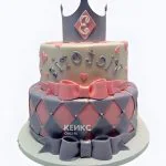 Этот торт — настоящая сказка для маленькой принцессы! Три яруса, украшенные нежной розовой мастикой, переливаются перламутровым блеском. Верхний ярус венчает изящная корона, усыпанная сахарными жемчужинами и золотыми акцентами. По бокам рассыпаны воздушные цветы и завитки, создающие ощущение праздничного балета. Мягкие пастельные оттенки и мерцающие детали делают этот торт волшебным центром внимания на любом детском торжестве.