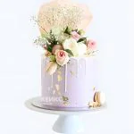 Этот элегантный круглый торт — настоящая симфония нежных оттенков. Основу украшает мягкий градиент от кремового к персиковому, создающий ощущение тепла и уюта. Роскошные сахарные цветы с тончайшими лепестками и макаруны в пастельных тонах добавляют торту изысканности. Каждый элемент декора продуман до мелочей, образуя гармоничную композицию. Торт выглядит утонченно и празднично, словно воплощение юбилейного настроения.