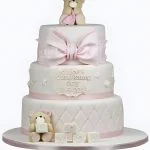 Нежный трехъярусный торт в пастельных тонах словно сошел со страниц сказки. Основной ярус украшен изящными бусинами и тонкими линиями, создающими ощущение кружева. Второй ярус оживляют очаровательные мишки, словно застывшие в танце. Верхний ярус венчает воздушный бант, добавляющий торту трогательную нотку. Розовые, кремовые и золотистые оттенки переливаются, создавая праздничное настроение. Каждая деталь продумана до мелочей, превращая десерт в настоящее произведение кондитерского искусства.