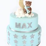 Яркий голубой торт с серебристыми звездами и мишкой на луне