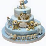 Этот яркий трехъярусный торт словно создан для детского праздника! Ослепительно-голубые ярусы украшены веселыми белыми облачками и золотыми звездочками. В центре композиции — очаровательные матовые мишки из мастики, окруженные стилизованными подарками с атласными бантами. Контрастные белые и синие элементы создают праздничное настроение, а золотые акценты добавляют торжественности. Каждый ярус обрамлен изящной белой окантовкой, подчеркивающей форму. Торт выглядит как воплощение радости и волшебства, идеально подходя для важного события.