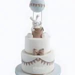 Нежный голубой торт с воздушными облаками и ярким воздушным шариком создает атмосферу детской мечты. Зайчик в корзинке словно парит в небе, а золотые звездочки добавляют волшебства. Двухъярусная композиция смотрится легко и празднично, а пастельные тона вызывают улыбку.