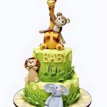 Этот яркий двухъярусный торт переносит в мир тропических приключений! На его поверхности разворачивается целая сказка: фигурки забавных животных — льва, обезьянки, слона — будто оживают среди пальм и сочной зелени. Голубые и бирюзовые оттенки создают ощущение прохлады джунглей, а золотистые акценты добавляют торту праздничного блеска. Каждый элемент тщательно проработан — от текстурной мастики, имитирующей кору деревьев, до мимики зверюшек. Такой торт не просто десерт, а настоящий мини-спектакль, который захочется рассматривать со всех сторон!