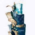Эстетичный трехъярусный торт на день рождения синий с золотом