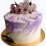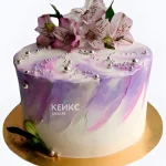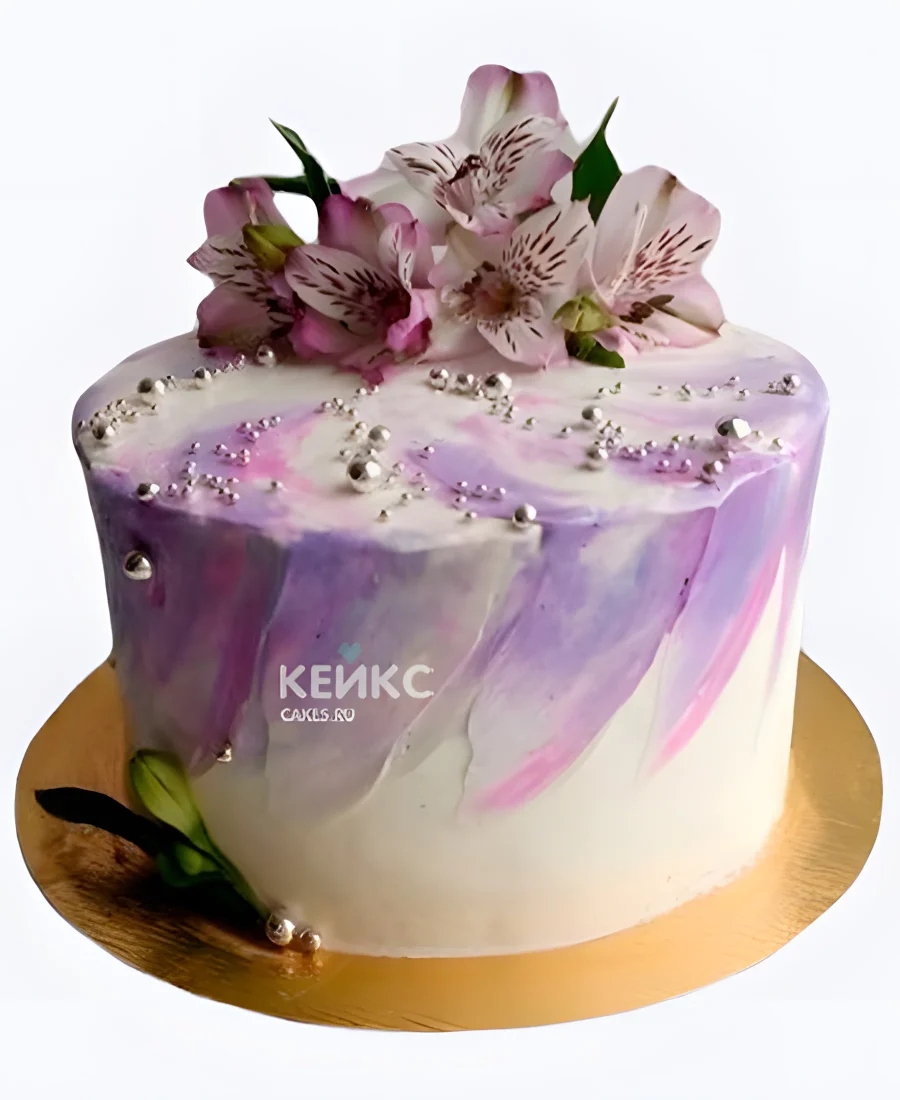 Фиолетовый свадебный торт с альстромериями и жемчугом
