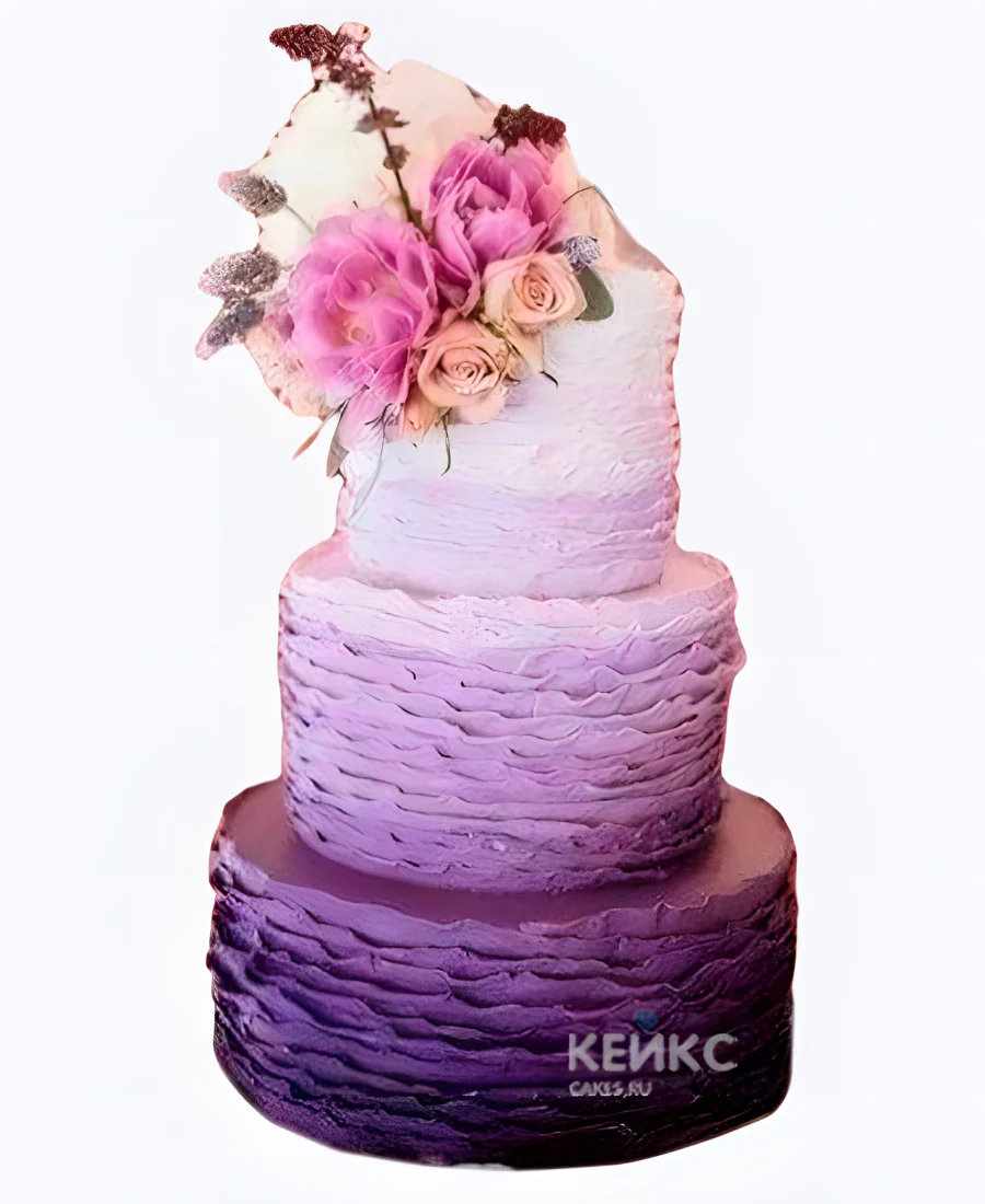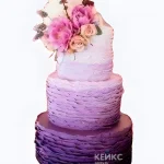 Фиолетовый свадебный торт с рюшами и букетом