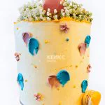 Нежный круглый торт в пастельных тонах с романтичным декором. Основа украшена воздушными кремовыми розами и нежными пионами, которые переливаются оттенками розового, сиреневого и персикового. Между цветами рассыпаны миниатюрные макаруны, добавляя торту игривости и легкости. Гладкая кремовая поверхность создает элегантный фон для цветочной композиции. Торт выглядит как весенний сад, застывший в сладком мгновении.
