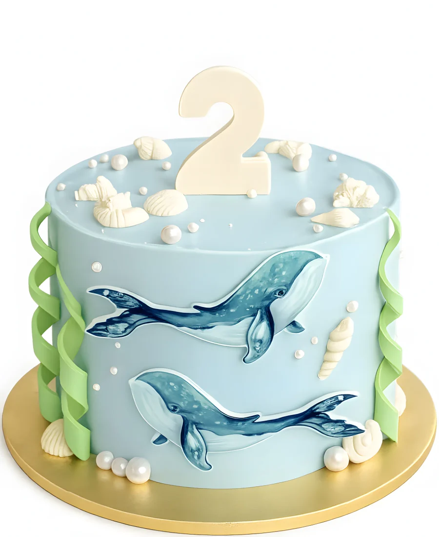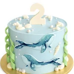 Голубой торт с мастичными топперами китов