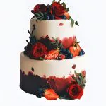 Нежный торт в пастельных тонах с плавными градиентными переходами. Две ярусные композиции украшены пышными розами и свежими ягодами, создавая ощущение цветущего сада. Мягкие кремовые текстуры и изящные детали придают торту воздушность и романтическое настроение.