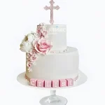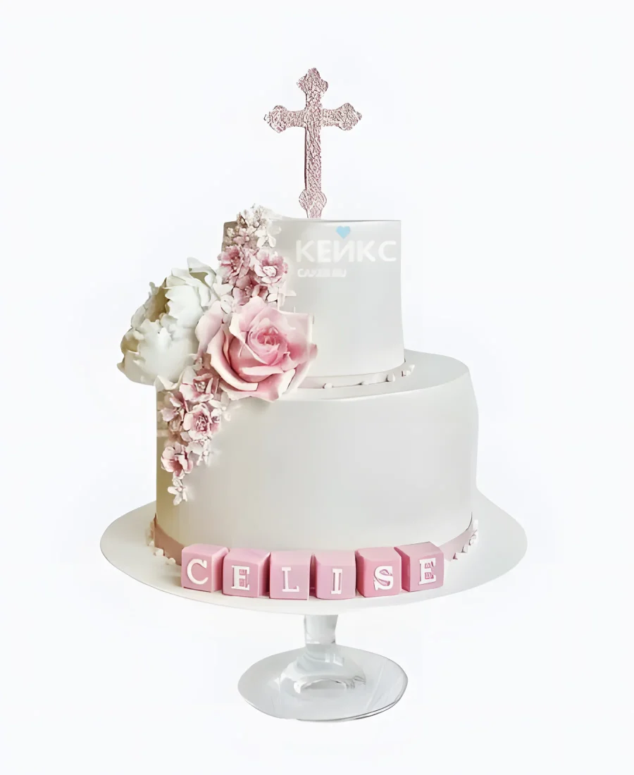 Изящный двухъярусный торт на крестины с цветами девочке