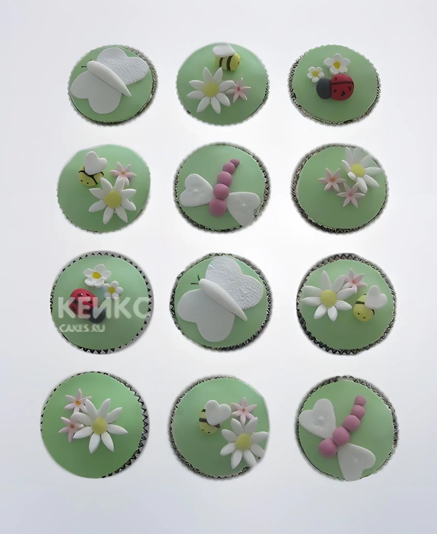 Зеленые капкейки со стрекозами и пчелками для девочки