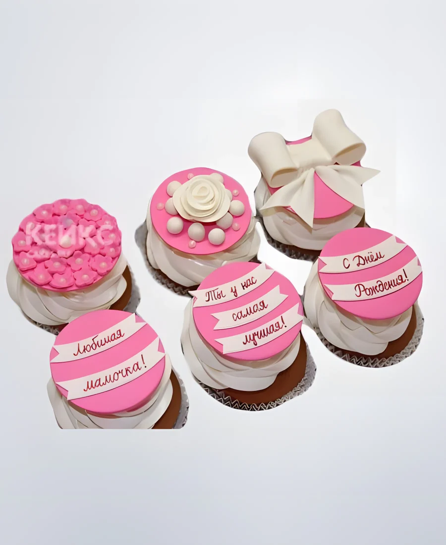 Бело-розовые капкейки с цветами и надписью для мамы
