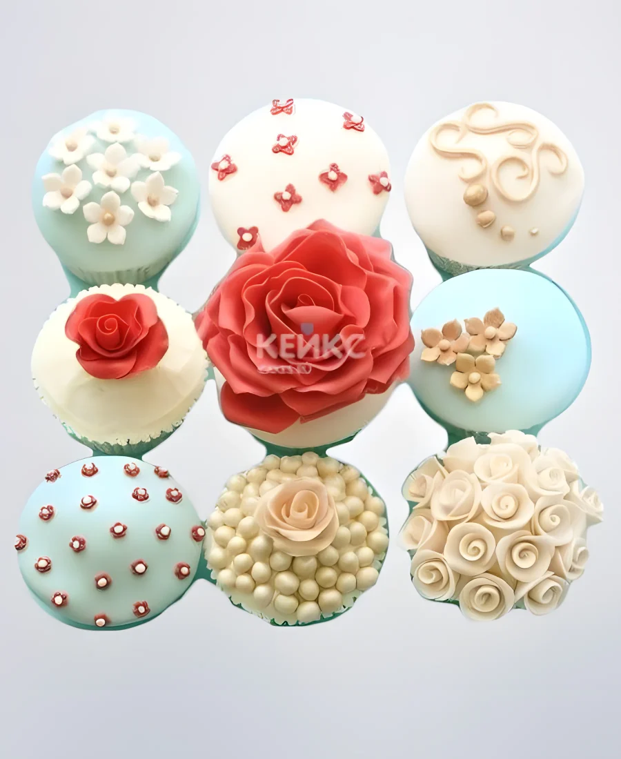 Бирюзово-белые капкейки с цветами для мамы