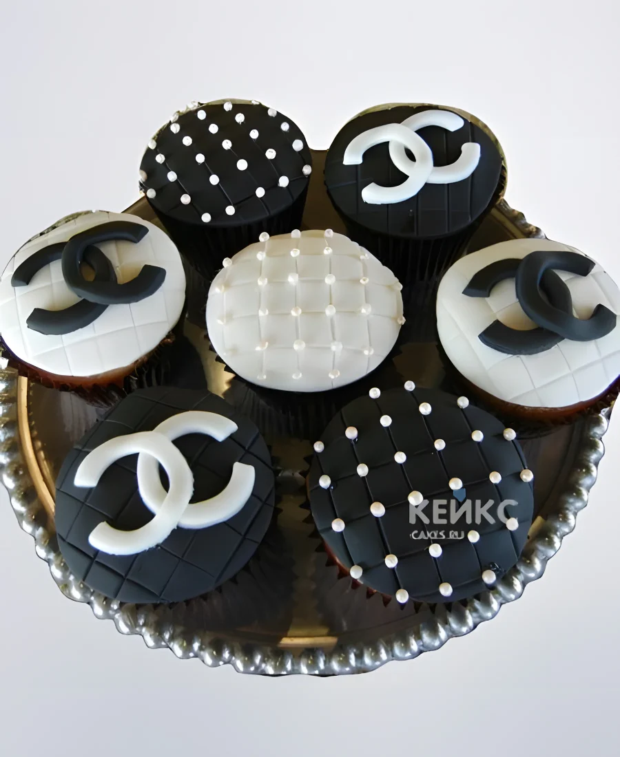 Черно-белые капкейки Шанель с логотипом и бусинами
