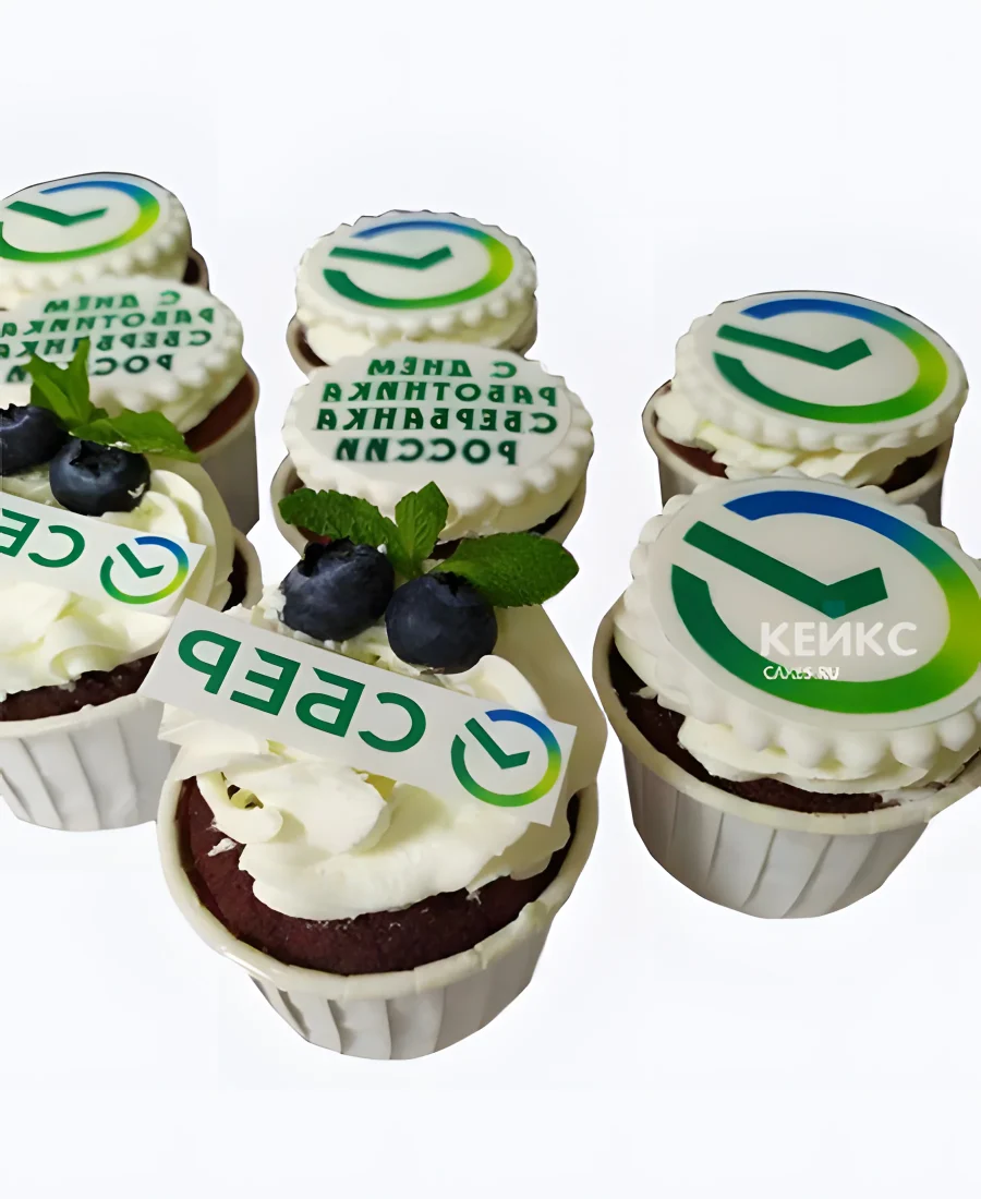 Корпоративные капкейки с фотопечатью сбербанка и ягодами